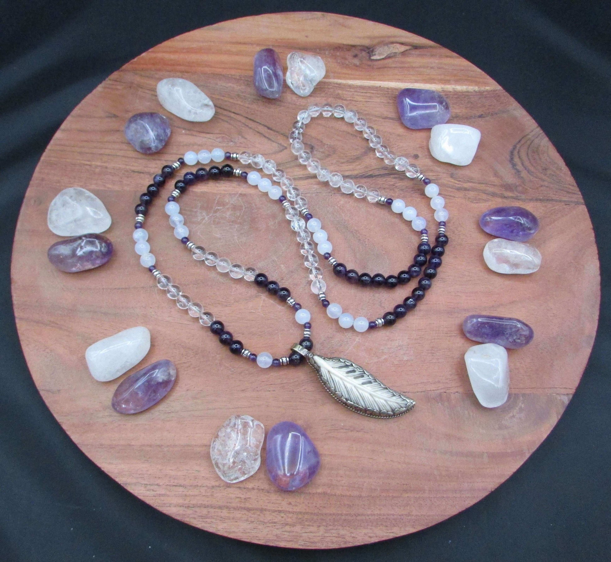 A sacred 108-bead meditation necklace, lovingly handcrafted and energetically charged through Angelic Crystal Reiki. Length: 39