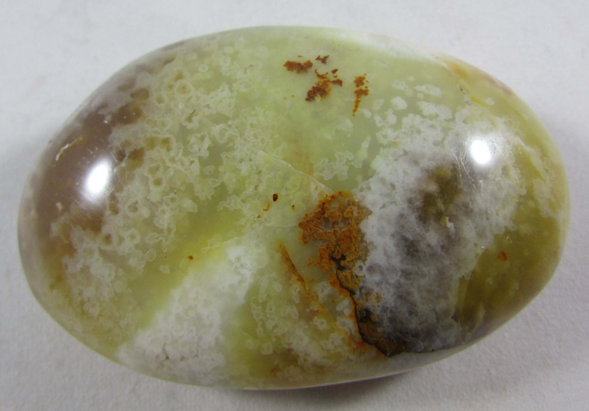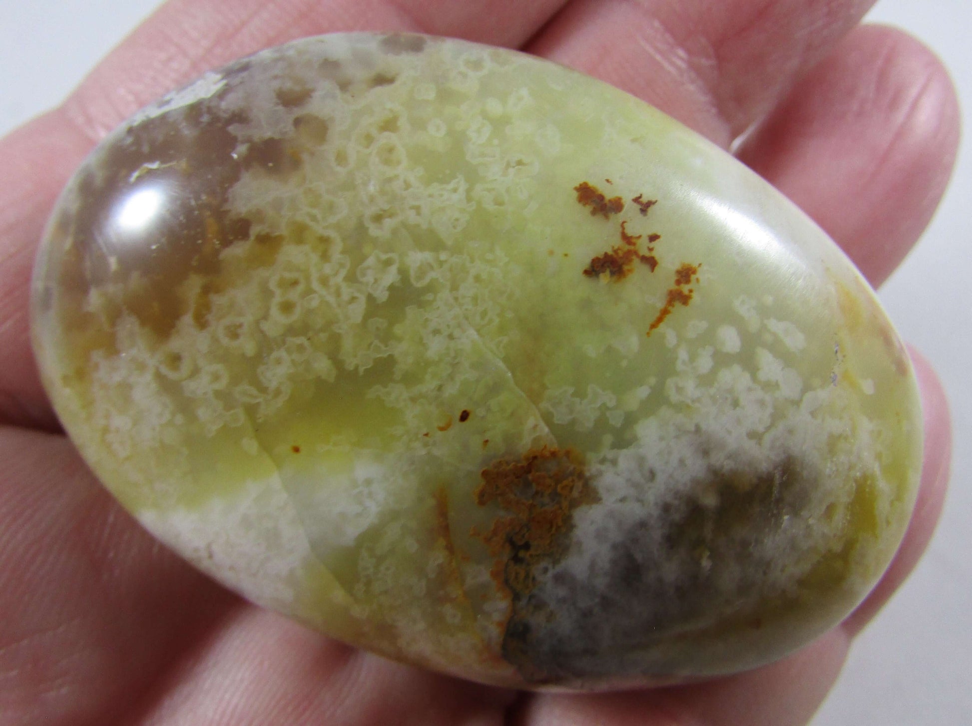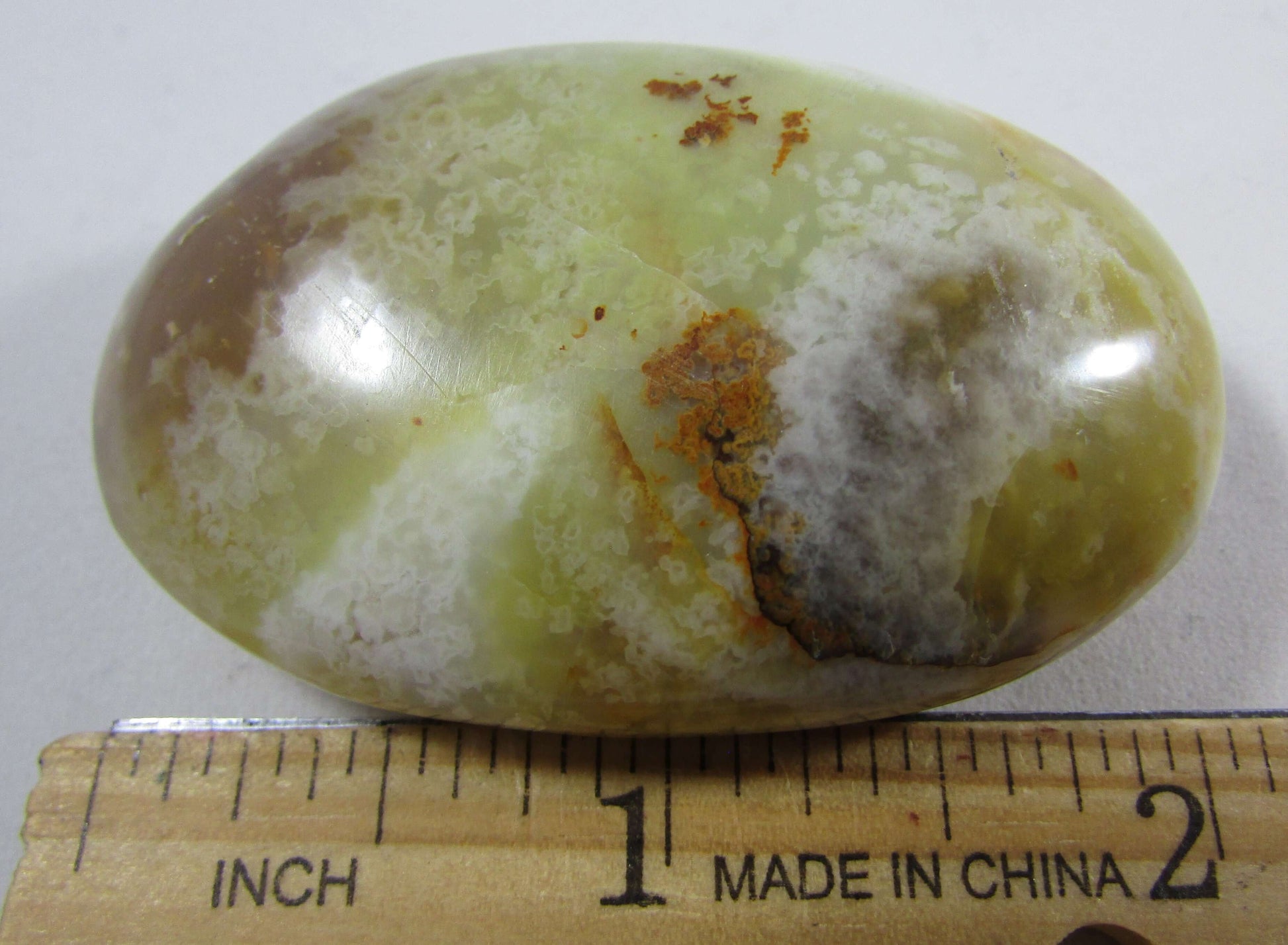 Experience this Madagascan Green Opal palmstone, featuring deep green to yellow-green hues. Known for expanding wealth consciousness while healing the heart chakra and raising vibrational frequency.