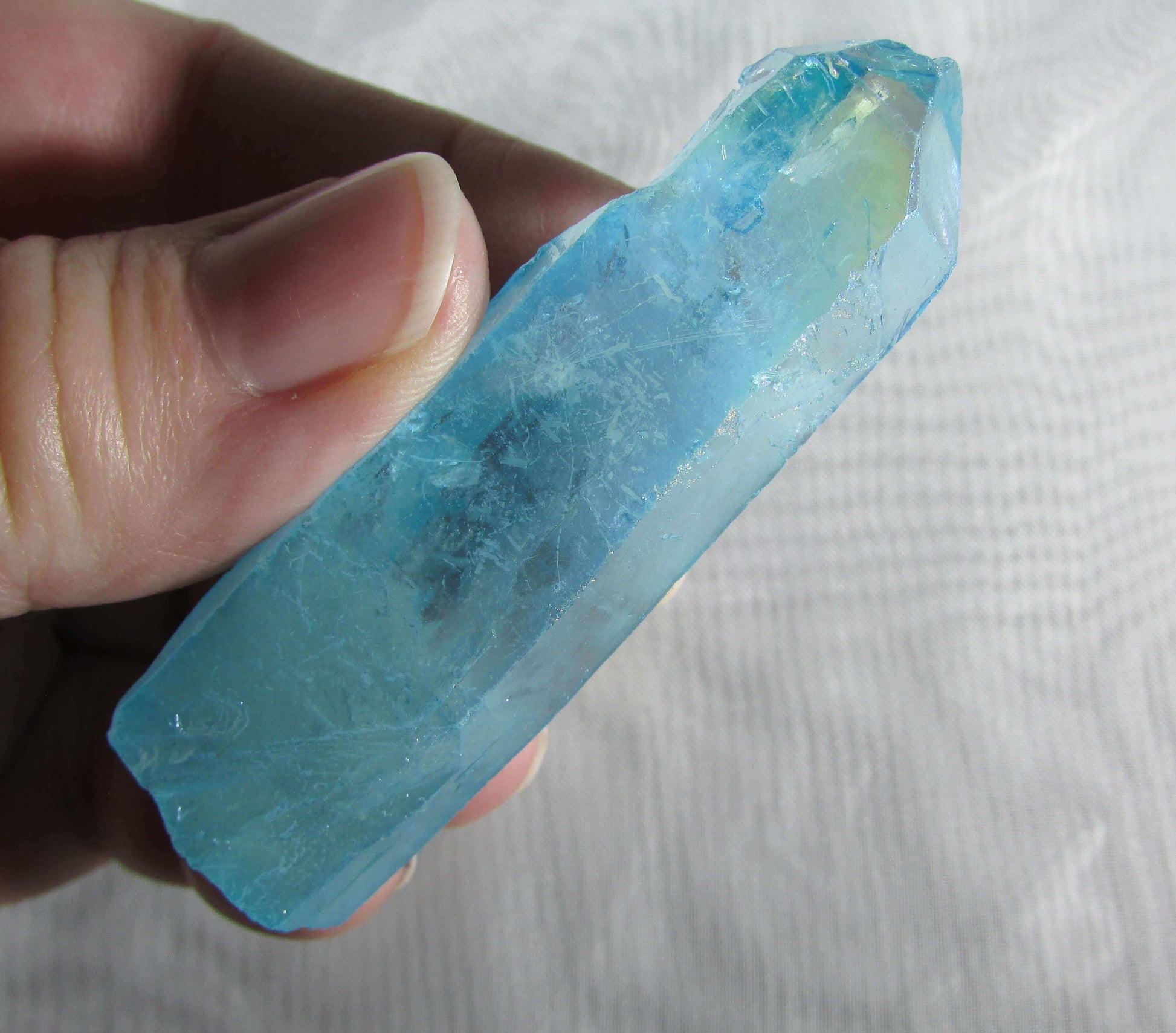 Aqua Aura Point: Infused with serene celestial energy, this crystal amplifies clarity, spiritual communication, and a sense of upliftment.