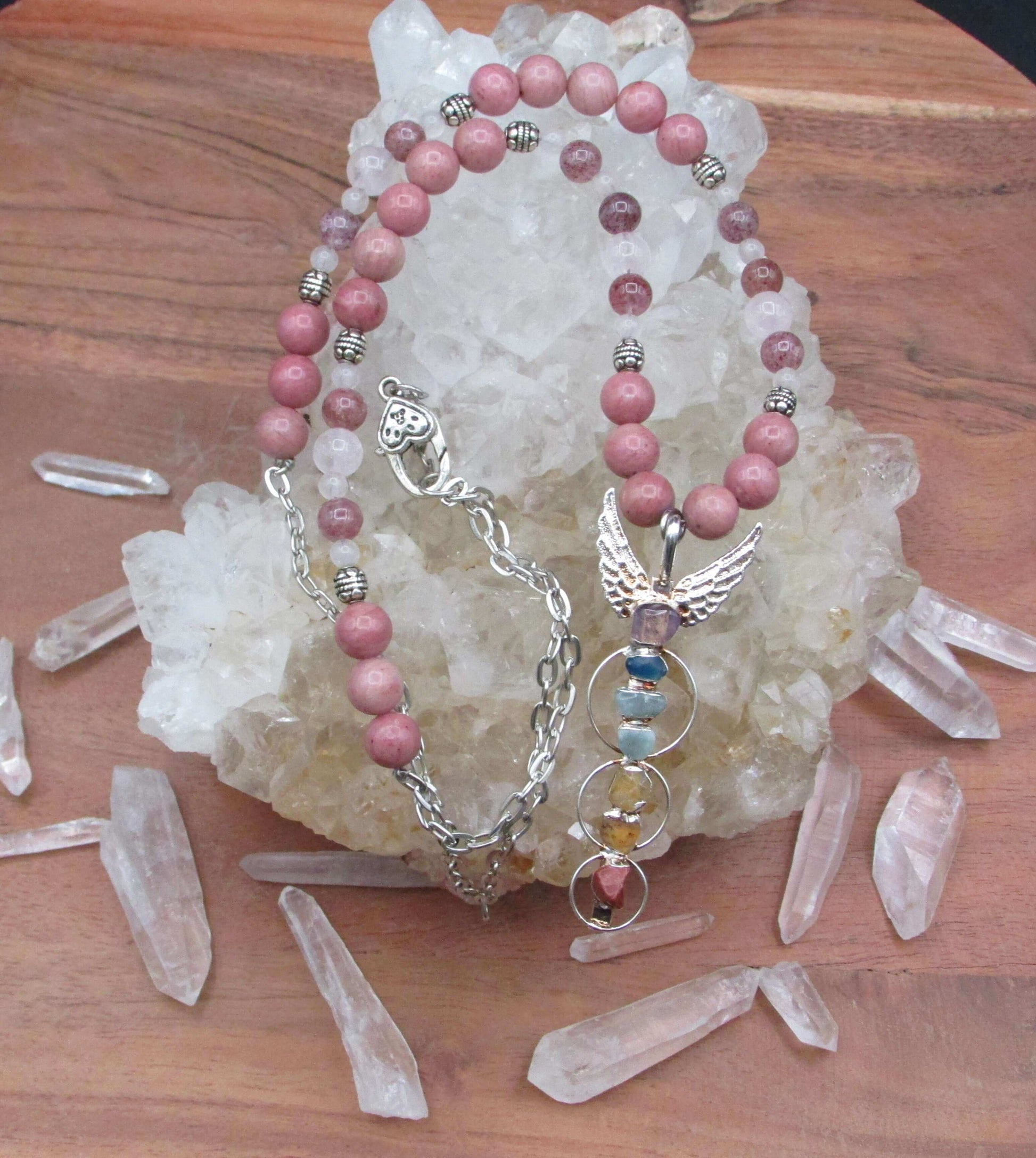 Heart Chakra Crystal Necklace - Rhodocrosite & Rose Quartz with Angel Wing