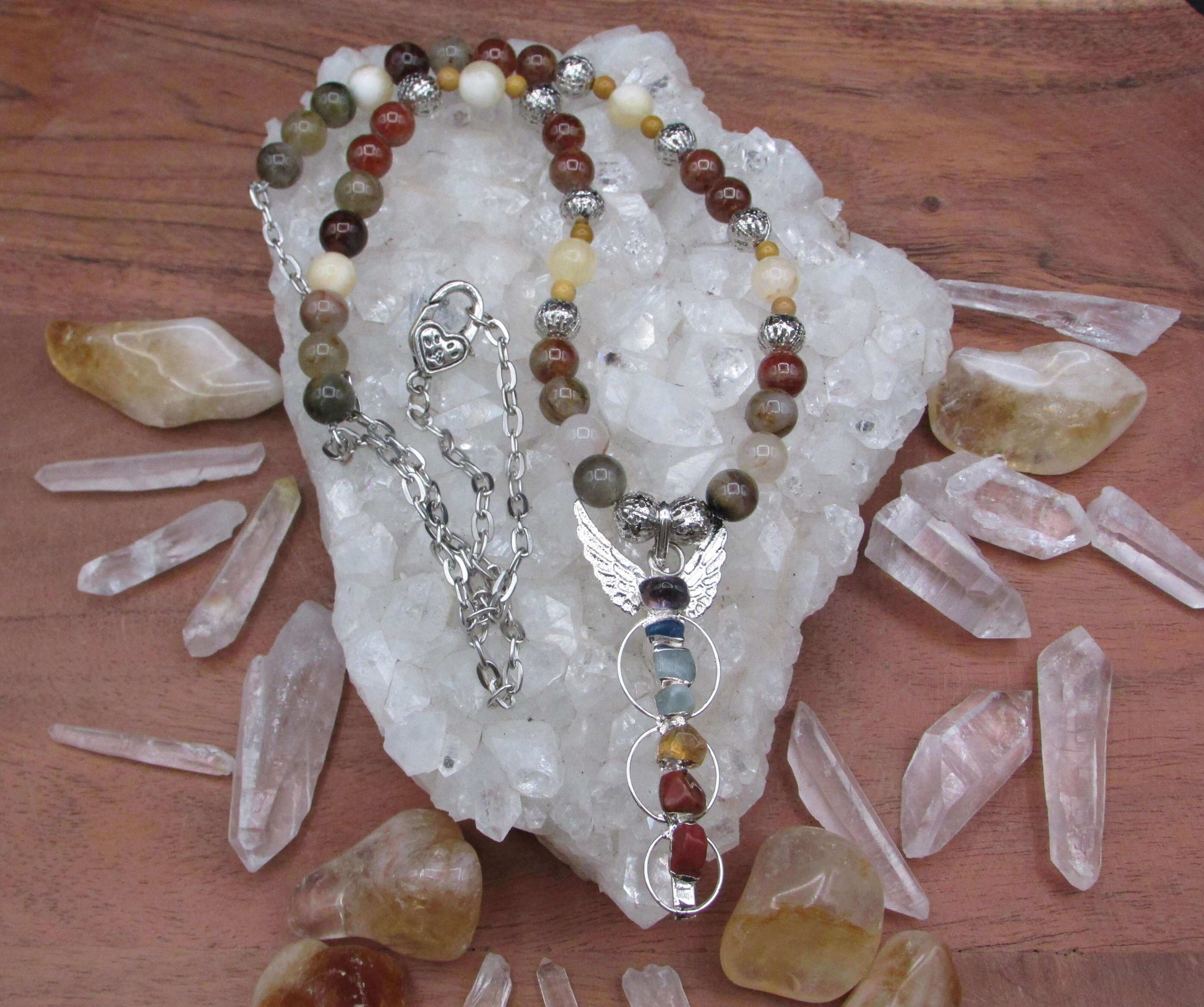 Root Chakra Crystal Necklace - Pietersite & Garnet with Angel Wing Pendant