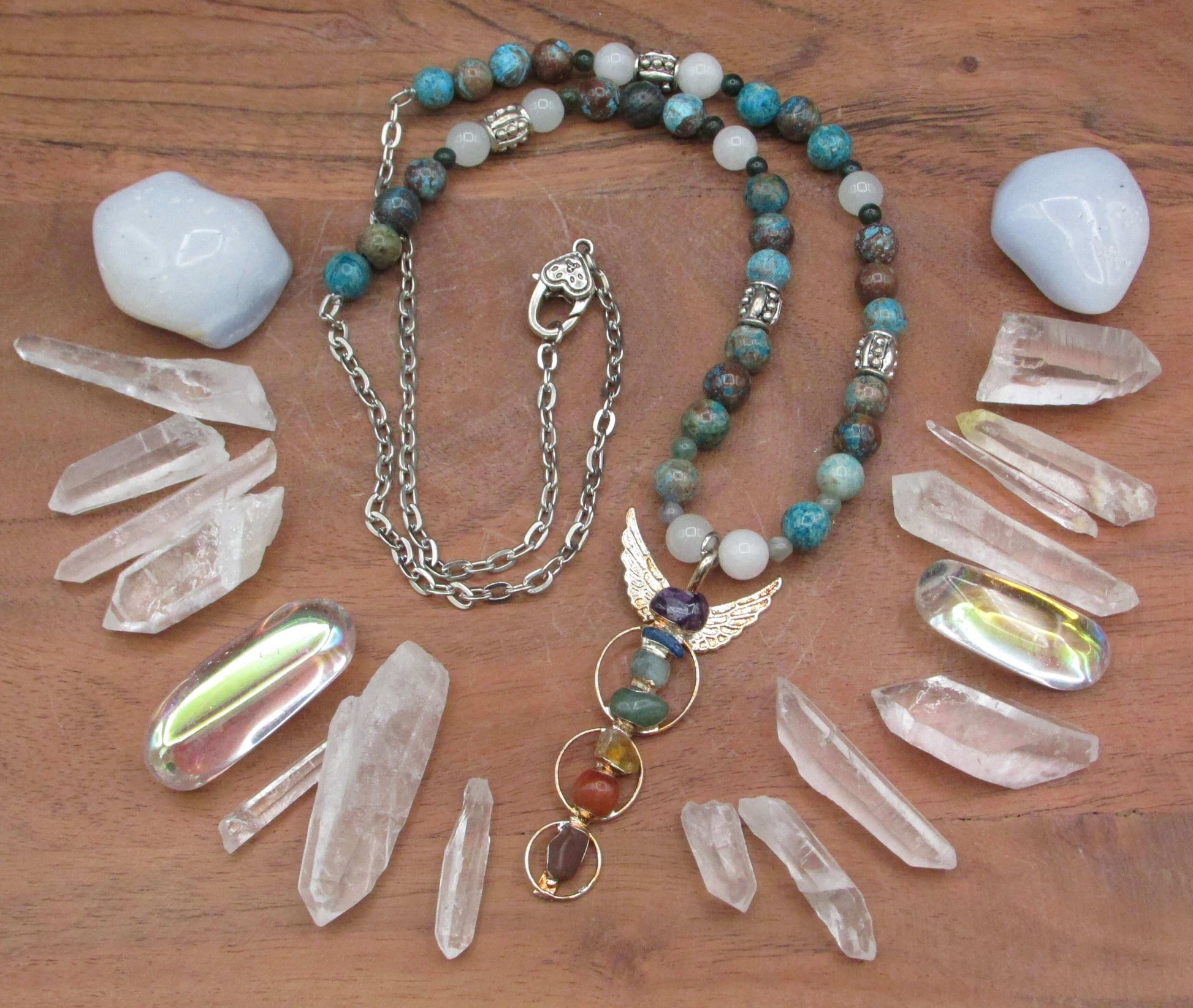 Throat Chakra Crystal Necklace - Blue Calsilica Jasper with Angel Wing