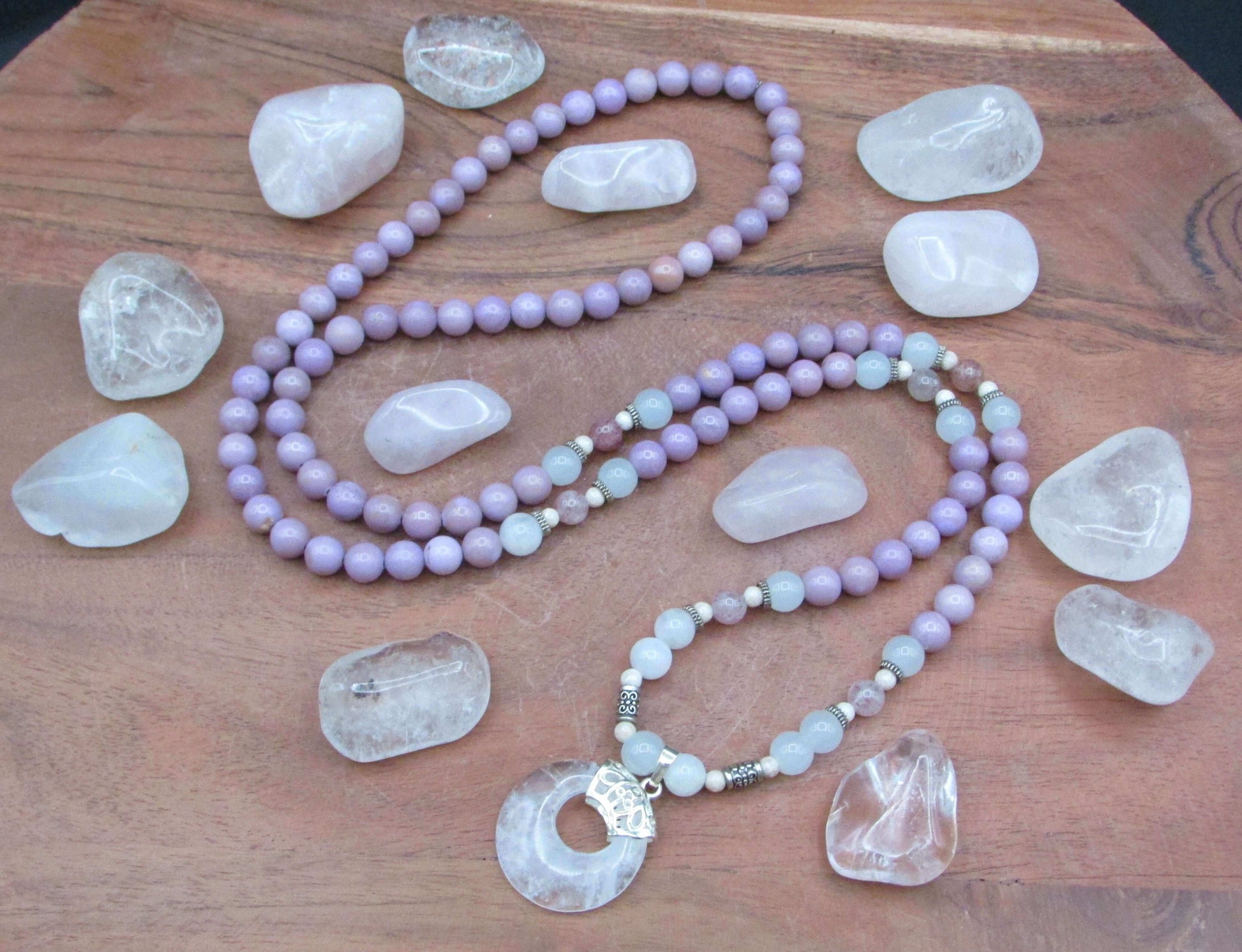 A sacred 108-bead meditation necklace, intuitively handcrafted and blessed with Crystal Reiki energy for heart healing and spiritual awakening. Length: 36"